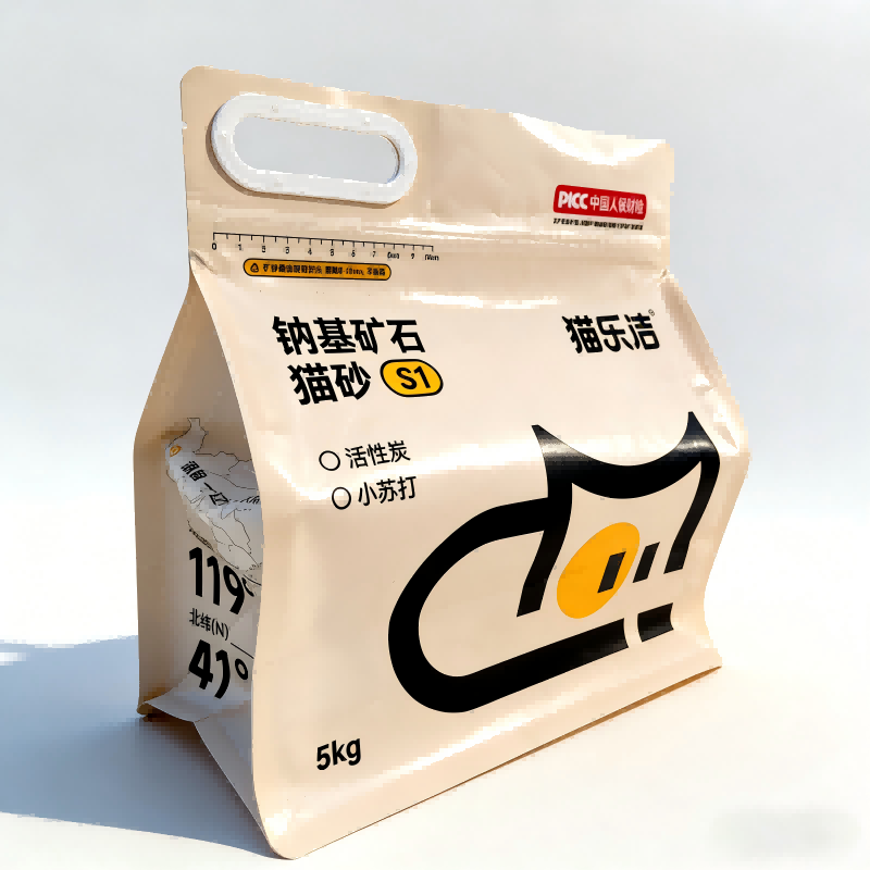 Η δομή σφράγισης οκτώ πλευρών διατηρεί την τσάντα σταθερή και όρθια, ιδανική για εμφανείς οθόνες ραφιών. Διευκολύνει επίσης τη σταθερή στοίβαξη και την άνετη αποθήκευση. Η λαβή με φερμουάρ παρέχει ασφαλή και αξιόπιστη στεγανοποίηση, αποτρέποντας την είσοδο υγρασίας και σκόνης ακόμη και με επαναλαμβανόμενο άνοιγμα και κλείσιμο. Επιπλέον, ο σχεδιασμός της ενισχυμένης πλαστικής λαβής επιτρέπει τον εύκολο χειρισμό 5 κιλών απορριμμάτων γάτας, βελτιώνοντας την εμπειρία του χρήστη.